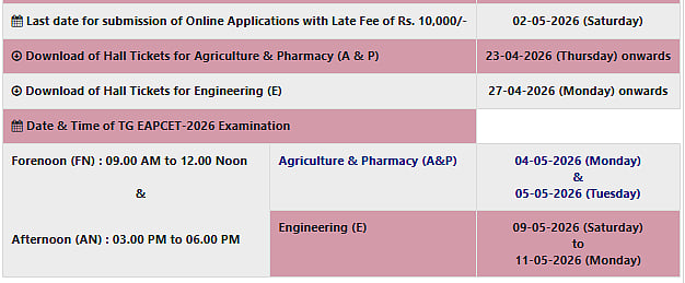 The Telangana Engineering, Agriculture, and Pharmacy Common Entrance Test (TG EAPCET 2026) for agriculture and pharmacy courses is scheduled to be held on May 4 and May 5. Candidates must carry their hall ticket along with a valid photo ID to the examination centre for verification.