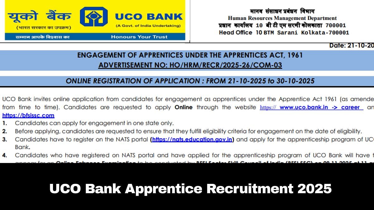 UCO Bank Apprentice Recruitment 2025: UCO Bank has opened applications for Apprenticeship positions. Qualified applicants can submit applications online at UCO Bank's official website, ucobank.in. This recruiting drive will fill 532 positions inside the organisation.