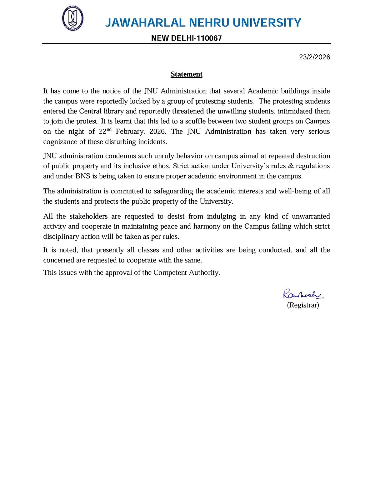In its official communication, the university said, “The JNU Administration has taken very serious cognisance of these disturbing incidents. Strict action under University rules & regulations and under BNS is being taken to ensure a proper academic environment on the campus.”
