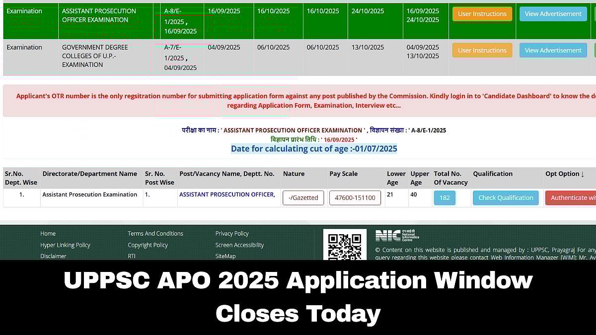 UPPSC APO Recruitment 2025: The Uttar Pradesh Public Service Commission (UPPSC) will end the application process for the Assistant Prosecution Officer (APO) Examination 2025 on October 16, 2025. Those who qualify can submit their applications online at the UPPSC's official website, uppsc.up.nic.in. According to the official data, the correction procedure will be open until October 24, 2025.