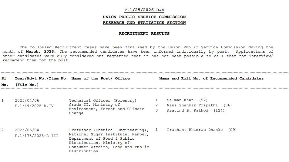 The Union Public Service Commission has released the recruitment results finalised during March 2026, according to an official update issued on April 17 by PIB Delhi. The commission has recommended candidates for several posts across ministries, while informing selected candidates individually through post.