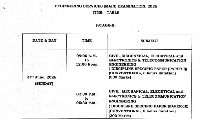 According to the official notification, the Engineering Services (Main/Stage II) Examination will take place in two shifts on Sunday, June 21, 2026. The first session will run from 9:00 a.m. to 12:00 noon, followed by the second session from 2:30 p.m. to 5:30 p.m.