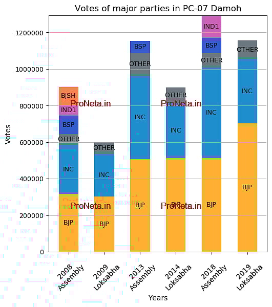 In 2019 there was 65.82% voter turnout in Damoh constituency. Prahalad Singh Patel, the BJP candidate, received 7.04 lakh votes and won the 2019 General Election by a margin of 3.53 lakh votes. With 3.51 lakh votes, Pratap Singh of the INC was beaten by Prahalad Singh Patel.