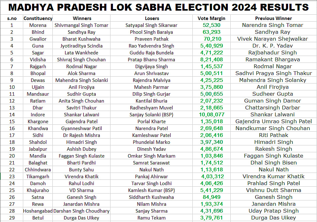 Bhopal (Madhya Pradesh): The result for the Lok Sabha elections 2024 has been declared by Election Commission of India on Tuesday. Madhya Pradesh has 29 parliamentary seats out of which 29 seats are bagged by Bhartiya Janata Party (BJP), whereas Indian National Congress (INC) was unable to bag even one seat.