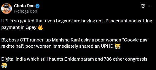 On X (Twitter), netizens have hilariously reacted to the viral video of Manisha and the beggar. A netizen tweeted, "UPI is so goated that even beggars are having an UPI account and getting payment in Gpay 🔥 Big boss OTT runner-up Manisha Rani asks a poor women 'Google pay rakhte hai', poor women immediately shared an UPI ID 😹 (sic)."