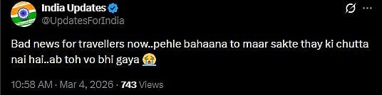 Another X user wrote, "Bad news for travellers now..pehle bahaana to maar sakte thay ki chutta nai hai..ab toh vo bhi gaya (sic)." Check out the comments below...