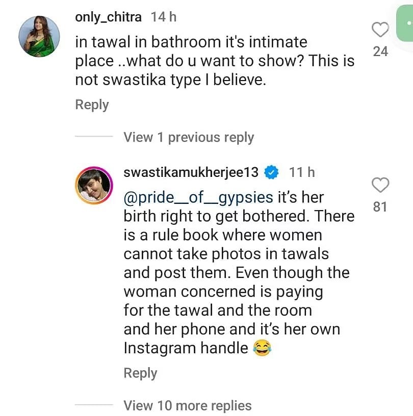 While fans showered love on the actress, others trolled her for the pictures. However, Swastika was in no mood to ignore the troll who commented, "In tawal (towel) in bathroom it's intimate place... what do u want to show? This is not swastika type I believe."