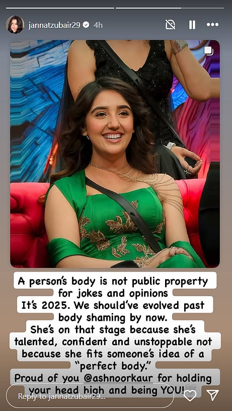 "A person’s body is not public property for jokes and opinions. It’s 2025 - we should’ve evolved past body shaming by now," she wrote. "She’s on that stage because she’s talented, confident, and unstoppable, not because she fits someone’s idea of a ‘perfect body.’ Proud of you, @ashnoorkaur, for holding your head high and being you," Jannat added.
