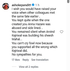 Pandit wrote, "I wish you would have raised your voice when other colleagues met the same fate earlier. You kept quite when the one created you Anna Hazare was abused and side lined. You remained silent when Arvind Kejriwal was building his sheesh Mahal. You can’t cry fowl now because you supported all the wrong which Kejriwal did. No sympathies for you."