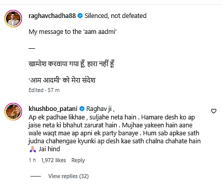 Commenting under his post, she wrote, "Raghav ji, aap ek padhae likhae, suljahe neta hain. Hamare desh ko aap jaise neta ki bahut zarurat hain. Mujhe yakeen hain aane wale waqt mein aap apni ek party banaye. Hum sab aapke sath judna chahengae kyunki aap desh ke sath chalna chahate hain. Jai hind."