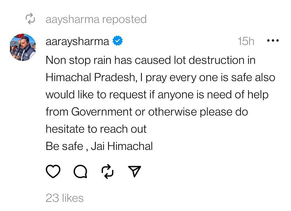 On Monday, Aayush shared his brother's post on social media, "Non stop rain has caused lot destruction in Himachal Pradesh, I pray every one is safe also would like to request if anyone is need of help from Government or otherwise please do hesitate to reach out Be safe, Jai Himachal. (sic)"
