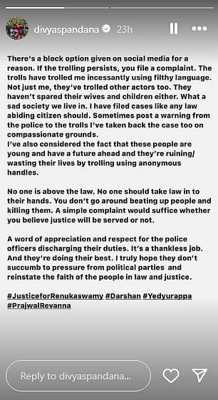 Divya took to her Instagram story and penned her thoughts about Renukaswamy's death and Darshan's arrest. She wrote, “There’s a block option given on social media for a reason. If the trolling persists, you file a complaint. The trolls have trolled me incessantly using filthy language. Not just me, they’ve trolled other actors too. They haven’t spared their wives and children either. What a sad society we live in. I have filed cases like any law abiding citizen should. Sometimes post a warning from the police to the trolls l have taken back the case too on compassionate grounds.”