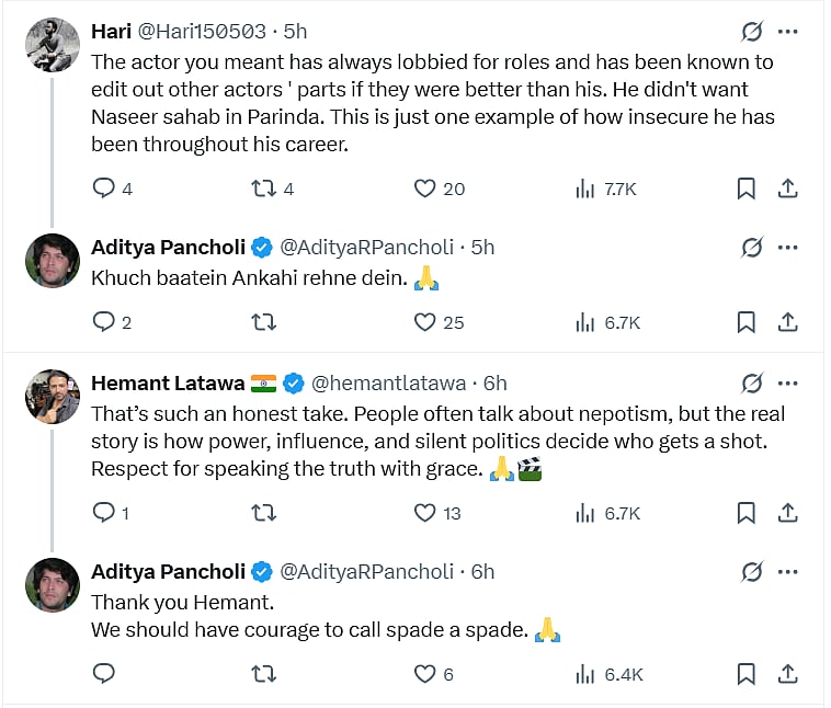 Reacting to his post, an X user commented, "The actor you meant has always lobbied for roles and has been known to edit out other actors' parts if they were better than his. He didn't want Naseer sahab in Parinda. This is just one example of how insecure he has been throughout his career."
