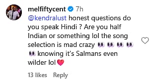 One more netizen commented, "@kendralust honest questions do you speak Hindi ? Are you half Indian or something lol the song selection is mad crazy 👀👀👀👀👀knowing it’s Salmans even wilder lol (sic)." Check out the comments below...
