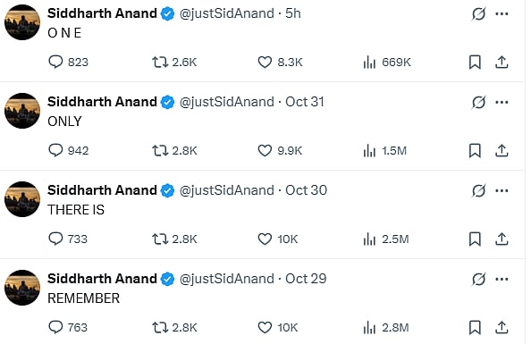 Siddharth on October 29 tweeted, "Remember." On October 30, he wrote, "There is." On October 31, he tweeted, "Only", and on November 1, he posted, "One."