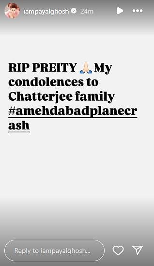 Telugu and Hindi film actress Payal Ghosh's college friend Preity Chatterjee passed away in the plane crash that happened in Ahmedabad on Thursday. The actress took to Instagram to mourn her friend's demise. She wrote on her Instagram story, "RIP Preity. My condolences to the Chatterjee family. #ahmedabadplanecrash."