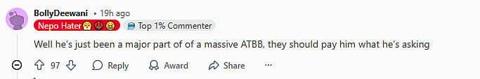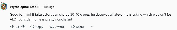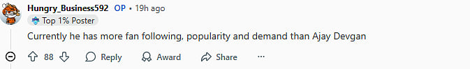 A Reddit user wrote, "Well he’s just been a major part of of a massive ATBB, they should pay him what he’s asking (sic)." Another netizen commented, "Currently he has more fan following, popularity and demand than Ajay Devgan (sic)."
