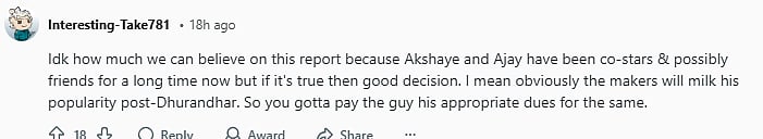 One more Reddit user wrote, "Idk how much we can believe on this report because Akshaye and Ajay have been co-stars & possibly friends for a long time now but if it's true then good decision. I mean obviously the makers will milk his popularity post-Dhurandhar. So you gotta pay the guy his appropriate dues for the same (sic)." Check out the comments below...