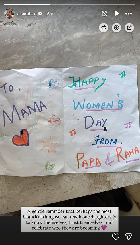 The adorable card, seemingly made by little Raha with colourful pens and playful doodles, carried a sweet message for Alia. One side of the folded sheet read “To Mama,” decorated with a heart and star drawings, while the other side said, “Happy Women’s Day From Papa & Raha,” written in bright colours along with small musical notes and scribbles.