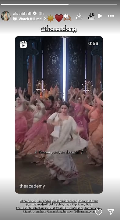 Alia has also reacted to it. Taking to Instagram Story, Alia shared The Academy's post and captioned it with red heart and Sun emojis.