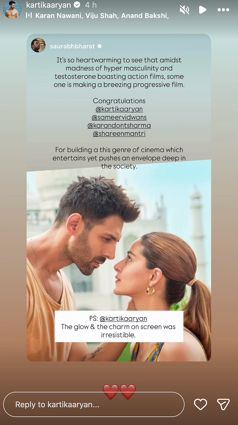 The actor shared a post by screenplay writer Saurabh Bharat on Monday, December 29, which praised the 'breezing progressive' Tu Meri Main Tera Main Tera Tu Meri. The post read, "It’s so heartwarming to see that amidst the madness of hypermasculinity and testosterone-boasting action films, someone is making a breezing progressive film. Congratulations. For building a genre of cinema which entertains yet pushes an envelope deep in the society."