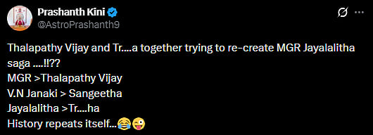 Without mentioning the name of the actress properly, the astrologer claimed that the history of MGR (M.G. Ramachandran) and Jayalalithaa will be recreated. Check out the tweet below...
