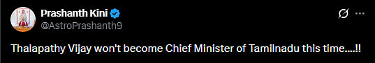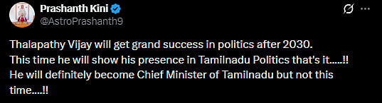 He tweeted, "Thalapathy Vijay will get grand success in politics after 2030. This time he will show his presence in Tamilnadu Politics that's it.....!! He will definitely become Chief Minister of Tamilnadu but not this time....!! (sic)." Kini also tweeted, "Thalapathy Vijay won't become Chief Minister of Tamilnadu this time....!! (ci)." Check out the tweets below...