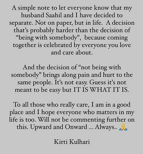 The note further read, "And the decision of 'not being with somebody' brings along pain and hurt to the same people. It's not easy. Guess it's not meant to be easy but IT IS WHAT IT IS. To all those who really care, I am in a good place and I hope everyone who matters in my life is too. Will not be commenting further on this. Upward and Onward... Always.. (sic)."