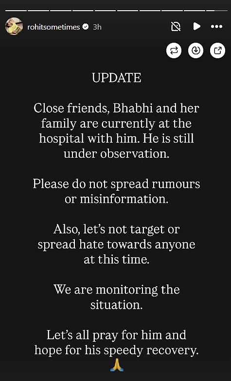 Taking to Instagram story on Sunday (March 8), Rohit wrote, “Update: Close friends, Bhabhi (Anurag's wife, Ritika Chauhan) and her family are currently at the hospital with him. He is still under observation. Please do not spread rumours or misinformation.”