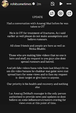 On Monday, March 9, taking to his Instagram story, Rohit said, "Had a conversation with Anurag bhai before he was taken to OT. He is in OT for treatment of fractures, As I said earlier as well, please do not make assumptions and believe rumours. All close friends and people are here as well as Ritika Bhabhi. Those who are making fake videos that no one is here and stuff, my request to you guys also don't spread rumours and hatred."