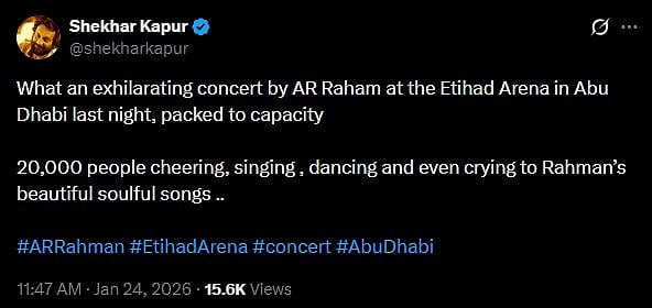 Filmmaker Shekhar Kapur also took to X (Twitter) to praise Rahman's concert in Dubai. He tweeted, "What an exhilarating concert by AR Raham at the Etihad Arena in Abu Dhabi last night, packed to capacity 20,000 people cheering, singing , dancing and even crying to Rahman’s beautiful soulful songs (sic)."