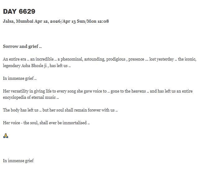 Veteran singer Asha Bhosle passed away on Sunday, at the age of 92. Many Indian celebrities took to social media to mourn her demise. Megastar Amitabh Bachchan, on Monday, wrote a long post about Bhosle and mourned her death. He wrote, {"Sorrow and grief .. An entire era .. an incredible .. a phenominal, astounding, prodigious , presence … lost yesterday .. the iconic, legendary Asha Bhosle ji , has left us .. In immense grief (sic)."