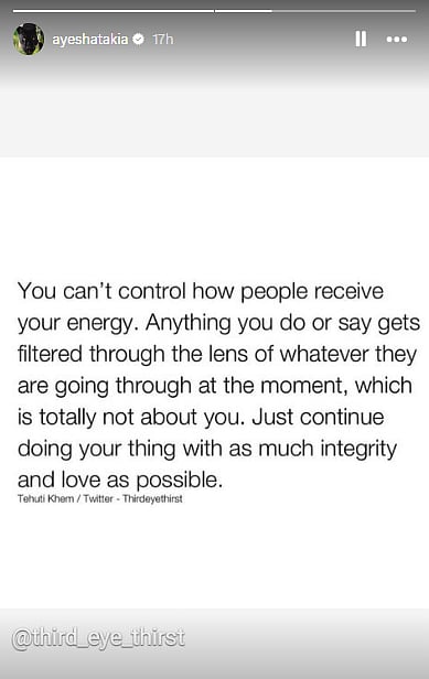 Sharing a monochrome selfie, she wrote, "Love and peace." Ayesha also re-shared an Instagram post on her story which read, "You can't control how people receive your energy. Anything you do or say gets filtered through the lens of whatever they are going through at the moment, which is totally not about you."