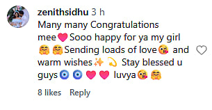 Friends and fans of the singer are very happy with the good news. A netizen commented on the post, "Many many Congratulations mee♥️Sooo happy for ya my girl🤗🤗Sending loads of love😘 and warm wishes✨💫 Stay blessed u guys🧿🧿♥️♥️ luvya (sic)."
