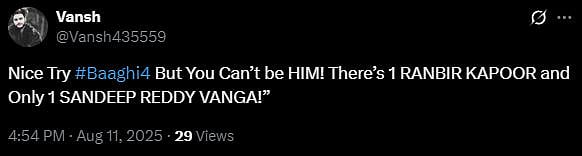 One more netizen tweeted, "Nice Try #Baaghi4 But You Can’t be HIM! There’s 1 RANBIR KAPOOR and Only 1 SANDEEP REDDY VANGA! (sic)." Check out the tweets below...