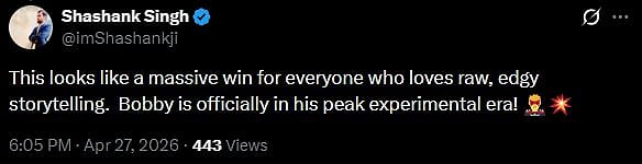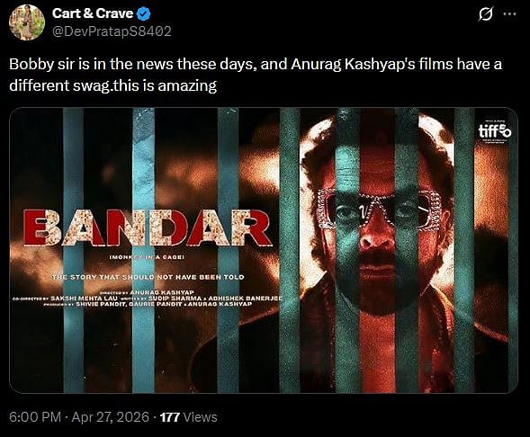 Many X users have shared that they are excited to watch Bandar. A netizen tweeted, "This looks like a massive win for everyone who loves raw, edgy storytelling. Bobby is officially in his peak experimental era! (sic)."
