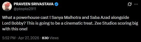 Another X user wrote, "What a powerhouse cast! Sanya Malhotra and Saba Azad alongside Lord Bobby? This is going to be a cinematic treat. Zee Studios scoring big with this one! (sic)."