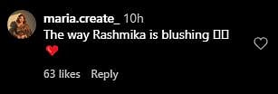 A fan commented on the video, "The way Rashmika is blushing ❤️ (sic)." Another Instagram user wrote, "Beautiful Jodi (sic)."