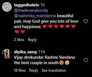 One more netizen commented, "@thedeverakonda @rashmika_mandanna beautiful pair, may God give you lots of love and happiness (sic)." Check out the comments below...
