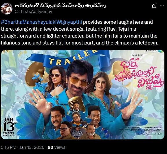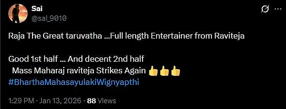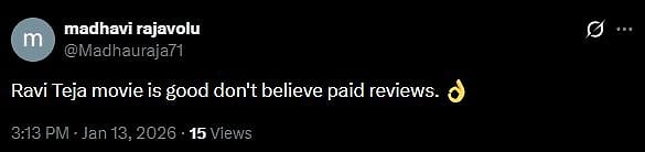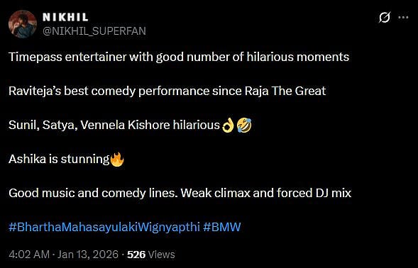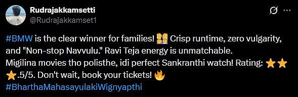 Another X user wrote, "#BMW is the clear winner for families! 👨👩👧👦 Crisp runtime, zero vulgarity, and "Non-stop Navvulu." Ravi Teja energy is unmatchable. Migilina movies tho polisthe, idi perfect Sankranthi watch! Rating: ⭐⭐⭐.5/5. Don't wait, book your tickets! (sic)."