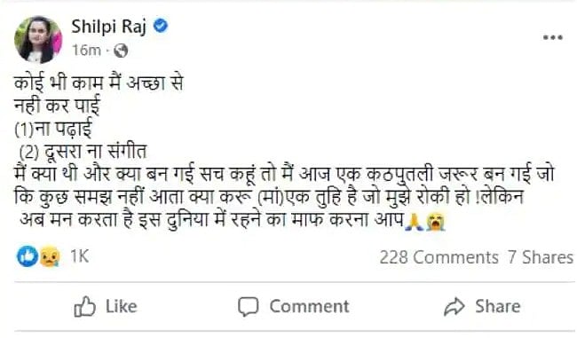 On Facebook, Shilpi wrote in Hindi, "I could not do well (1) neither studies (2) nor music… what I was and what I have become, to tell the truth, today I have definitely become a puppet, who does not understand what to do (mother) Only you were the one who warned me, But, now I don’t feel like living in this world, please forgive."