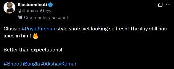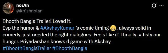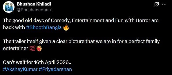 A netizen tweeted, "Classic #Priyadarshan style shots yet looking so fresh! The guy still has juice in him! 🔥 Better than expectations! (sic)." Another X user wrote, "The good old days of comedy, entertainment, and fun with horror are back with #BhoothBangla 🔥 The trailer itself gives a clear picture that we are in for a perfect family entertainer 💯❤️🔥 Can't wait for 16th April 2026.. (sic)."