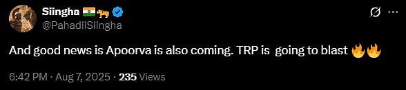 A netizen tweeted, "And it starts, the filling of kachra influencers to once a good show that it was (sic)." Another X user wrote, "And good news is Apoorva is also coming. TRP is going to blast (sic)."