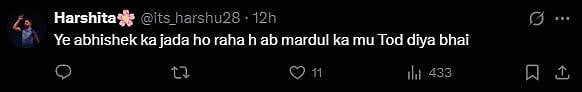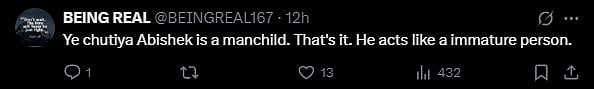 A netizen tweeted, "Ye ch**iya Abishek is a manchild. That's it. He acts like a immature person (sic)." Another X user wrote, "Ye abhishek ka jada ho raha h ab mardul ka mu Tod diya bhai (sic)."