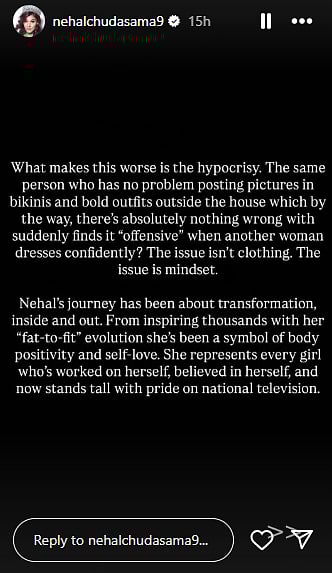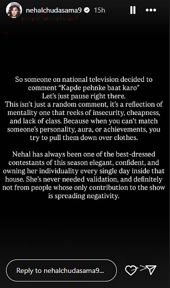 Nehal's team shared a long note on her Instagram story which read, "So someone on national television decided to comment 'Kapde pehnke baat karo' Let's just pause right there. This isn't just a random comment, it's a reflection of mentality one that reeks of insecurity, cheapness, and lack of class. Because when you can't match someone's personality, aura, or achievements, you try to pull them down over clothes. Nehal has always been one of the best-dressed contestants of this season elegant, confident, and owning her individuality every single day inside that house. She's never needed validation, and definitely not from people whose only contribution to the show is spreading negativity."