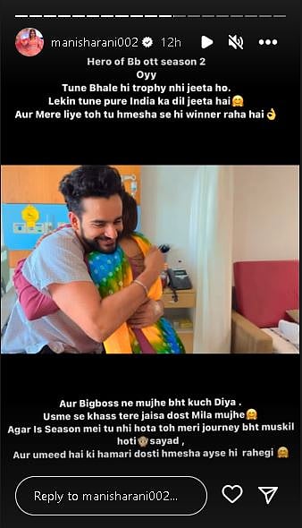 Taking to her Instagram account to share the heartwarming video, Manisha's message echoes the sentiment of their enduring friendship. She writes, "Hero of Bigg Boss OTT season 2. Oye. You may not have won the trophy, but you definitely won the whole nation's hearts. And you will always be the winner for me." Her affectionate words reflect the profound impact that Abhishek has had, not just in the competition but in their personal connection as well.
