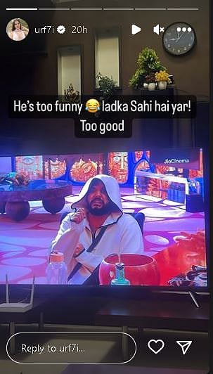Furthermore, Uorfi couldn't resist but admit that she is loving the wildcard entry Elvish Yadav inside the Bigg Boss house. In another Instagram story she shared, she wrote a caption, "He's too funny. Ladka sahi hai yaar. Too good!"