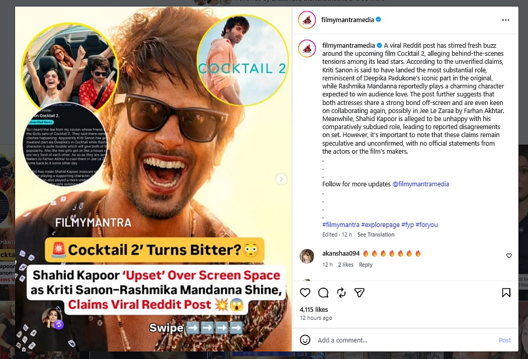 The post read, "Kriti Sanon is said to have landed the most substantial role, reminiscent of Deepika Padukone’s iconic part in the original, while Rashmika Mandanna reportedly plays a charming character expected to win audience love. The post further suggests that both actresses share a strong bond off-screen and are even keen on collaborating again, possibly in Jee Le Zaraa by Farhan Akhtar. Meanwhile, Shahid Kapoor is alleged to be unhappy with his comparatively subdued role, leading to reported disagreements on set. However, it’s important to note that these claims remain speculative and unconfirmed, with no official statements from the actors or the film’s makers."
