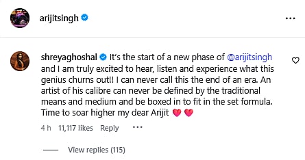 Soon after Arijit shared his announcement on social media, Shreya responded with an encouraging message in the comments section of his post. Applauding his choice, she described the move not as a farewell but as a new beginning for the celebrated artist.
