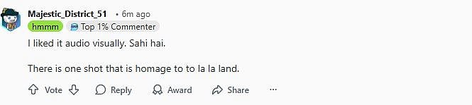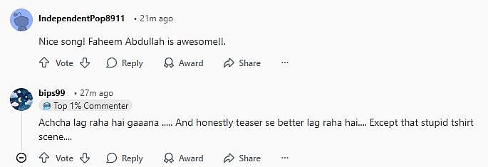 As soon as the song was released, it became a topic of discussion on Reddit, and it has received mixed reviews from netizens. A Reddit user commented, "Achcha lag raha hai gaaana..... And honestly teaser se better lag raha hai.... Except that stupid tshirt scene (sic)."